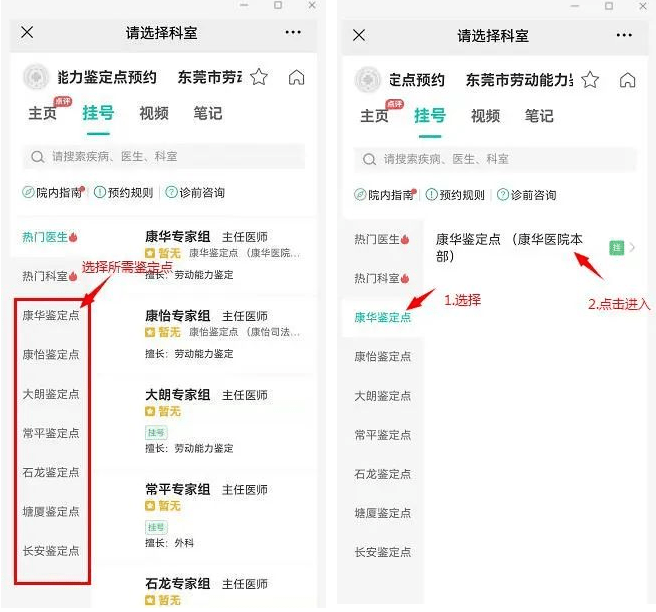 怎樣預(yù)約? 操作步驟看下方 ↓↓↓ 申請(qǐng)人可通過(guò) 手機(jī)登錄“健康160”APP、“健康160”微信公眾號(hào),或使用 電腦登錄“健康160”網(wǎng)頁(yè)(https://www.91160.com/)等方式,在“掛號(hào)”欄目中查找“東莞市勞動(dòng)能力鑒定點(diǎn)預(yù)約”,并完成鑒定場(chǎng)地和時(shí)間段的預(yù)約,或 進(jìn)行預(yù)約。 (一)登錄“東莞市勞動(dòng)能力鑒定點(diǎn)預(yù)約”界面,查看鑒定點(diǎn),選擇自己所需鑒定點(diǎn)