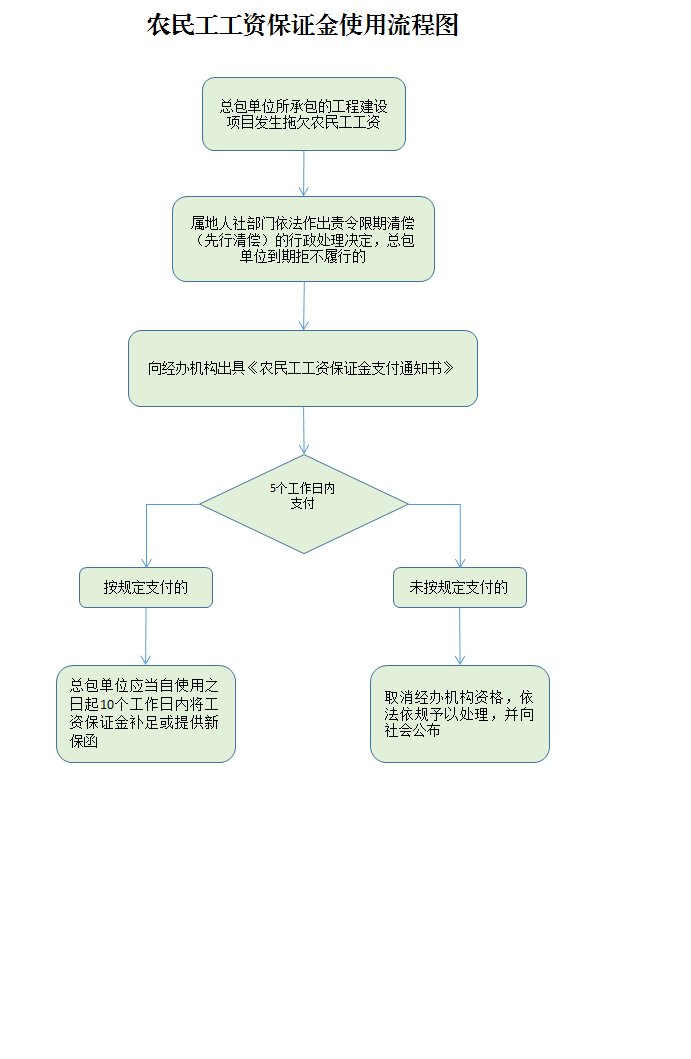 | 事項(xiàng)名稱 工程建設(shè)領(lǐng)域農(nóng)民工工資保證金使用 使用依據(jù) 《煙臺(tái)市工程建設(shè)領(lǐng)域農(nóng)民工工資保證金管理實(shí)施細(xì)則》(煙人社發(fā)[2022]17號(hào)) 操作主體 屬地人力資源社會(huì)保障行政部門和經(jīng)辦銀行、擔(dān)保公司、保險(xiǎn)公司 支付對(duì)象 被拖欠工資農(nóng)民工本人 使用情形 總包單位所承包工程建設(shè)項(xiàng)目發(fā)生拖欠農(nóng)民工工資的,經(jīng)屬地人力資源社會(huì)保障行政部門依法作出責(zé)令限期清償(先行清償)的行政處理決定,總包單位到期拒不履行的。 使用流程 屬地人社部門→向經(jīng)辦機(jī)構(gòu)出具《農(nóng)民工工資保證金支付通知書》,附支付對(duì)象身份信息及其收款行賬號(hào)和開戶行→經(jīng)辦機(jī)構(gòu)5個(gè)工作日內(nèi)將工資支付到被拖欠工資農(nóng)民工本人→總包單位應(yīng)當(dāng)自使用之日起10個(gè)工作日內(nèi)將工資保證金補(bǔ)足或提供新保函