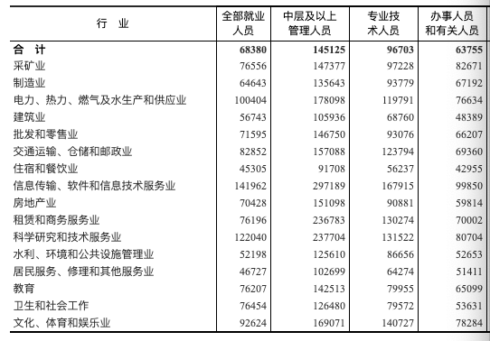 | 2018年平均工資主要數(shù)據(jù)于今日(14日)正式出爐。國家統(tǒng)計局發(fā)布的數(shù)據(jù)顯示,2018年全國城鎮(zhèn)非私營單位就業(yè)人員年平均工資為82461元,全國城鎮(zhèn)私營單位就業(yè)人員年平均工資為49575元;全國規(guī)模以上企業(yè)就業(yè)人員年平均工資為68380元。其中,中層及以上管理人員平均工資最高,為145125元,是全部就業(yè)人員平均水平的2.12倍;社會生產(chǎn)服務(wù)和生活服務(wù)人員平均工資最低,是全部就業(yè)人員平均水平的80%。