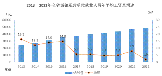 注[1]:文中以下增長,除特別指出外,均為名義增長。 2022年甘肅省全省城鎮(zhèn)私營單位就業(yè)人員年平均工資為48108元 2022年全省城鎮(zhèn)私營單位就業(yè)人員年平均工資為48108元,比上年增加896元,名義增長[1]1.9%?鄢齼r格因素,2022年全省城鎮(zhèn)私營單位就業(yè)人員年平均工資實際增長1.0%。