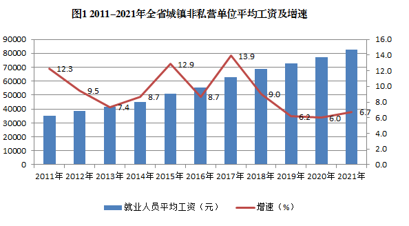 二、城鎮(zhèn)私營(yíng)單位 2021年,全省城鎮(zhèn)私營(yíng)單位就業(yè)人員平均工資48185元,比上年增加3243元,名義增長(zhǎng)7.2%,增速比2020年提高2.5個(gè)百分點(diǎn)?鄢齼r(jià)格因素,2021年全省城鎮(zhèn)私營(yíng)單位就業(yè)人員平均工資實(shí)際增長(zhǎng)6.2%。