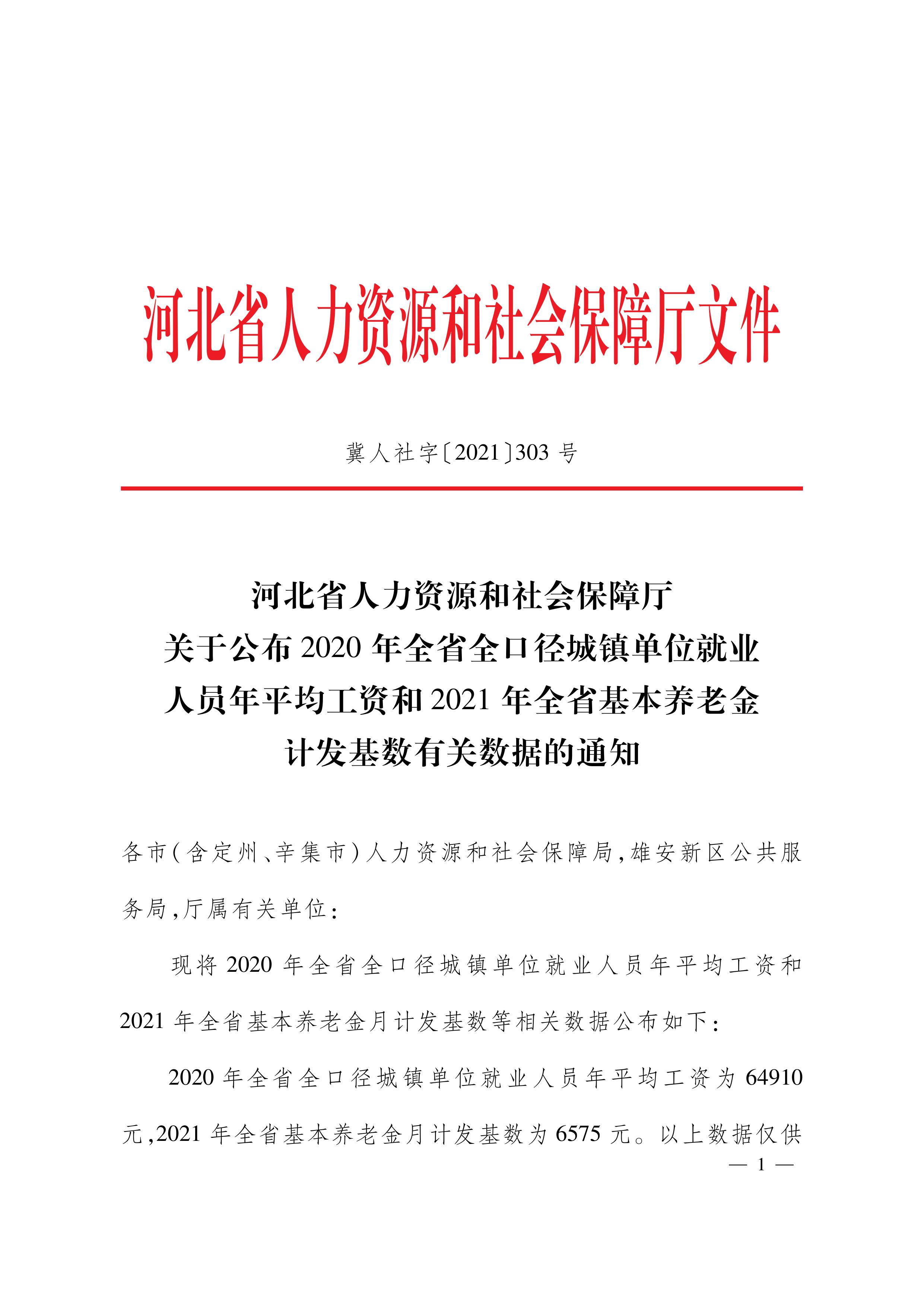 河北省關(guān)于公布2020年全省全口徑城鎮(zhèn)單位就業(yè)人員年平均工資和2021年全省基本養(yǎng)老金計發(fā)基數(shù)有關(guān)數(shù)據(jù)的通知冀人社字[2021]303號 各市(含定州、辛集市)人力資源和社會保障局,雄安新區(qū)公共服務(wù)局,廳屬有關(guān)單位: 現(xiàn)將2020年全省全口徑城鎮(zhèn)單位就業(yè)人員年平均工資和2021年全省基本養(yǎng)老金月計發(fā)基數(shù)等相關(guān)數(shù)據(jù)公布如下: 2020年全省全口徑城鎮(zhèn)單位就業(yè)人員年平均工資為64910元,2021年全省基本養(yǎng)老金月計發(fā)基數(shù)為6575元。以上數(shù)據(jù)僅供在人力資源社會保障工作中統(tǒng)一使用。 河北省人力資源和社會保障廳 2021年11月8日