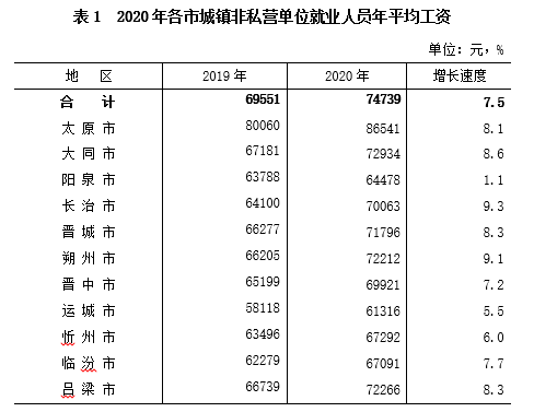 分市看,2020年城鎮(zhèn)非私營單位就業(yè)人員年平均工資由高到低排前3位的市分別是太原市86541元、大同市72934元、呂梁市72266元;排后3位的市分別是運(yùn)城市61316元、陽泉市64478元、臨汾市67091元。 增速排前3位的市分別是長治市9.3%、朔州市9.1%、大同市8.6%;排后3位的市分別是陽泉市1.1%、運(yùn)城市5.5%、忻州市6.0%。最高和最低的市年平均工資之比為1.4,與上年相比差距有所擴(kuò)大。