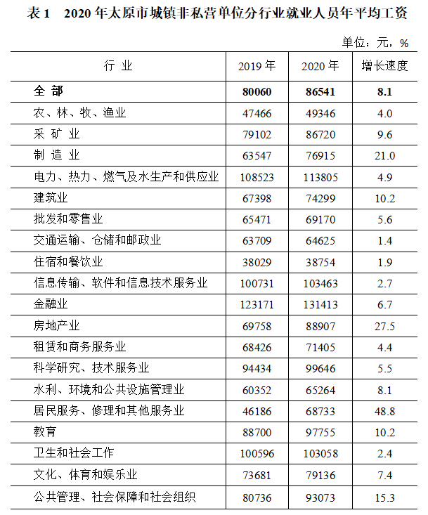 | 2020年太原市平均工資(社平工資) 2020年太原市城鎮(zhèn)非私營單位就業(yè)人員年平均工資為86541元(折合月平均工資7211元,四舍五入)。 2020年太原市在崗職工(含勞務(wù)派遣人員)年平均工資為88650元(折合月平均工資7388元)。 工傷賠償是怎樣的???戳此:智能AI工傷計算器自助秒算賠償! 工傷賠償標(biāo)準(zhǔn)網(wǎng)(m.michaeltmooney.com)專業(yè)工傷、專注工傷 工傷就上工傷賠償標(biāo)準(zhǔn)網(wǎng)你的賠償超乎你想象! 深圳及其周邊地區(qū)免費咨詢微信:gspc12333。 到店免費計算工傷賠償送禮品!地址:深圳市龍崗區(qū)龍城街道龍崗大道2002號千百年商業(yè)大廈17樓(愛聯(lián)地鐵站A出口即到)】 2020年太原市城鎮(zhèn)非私營單位就業(yè)人員年平均工資為86541元2020年太原市城鎮(zhèn)非私營單位就業(yè)人員年平均工資為86541元,比上年增加6481元,名義增長[1]8.1%,扣除價格因素,實際增長5.4%。在崗職工(含勞務(wù)派遣人員)年平均工資為88650元。 分行業(yè)門類看,年平均工資最高的3個行業(yè)分別是金融業(yè)131413元,電力、熱力、燃?xì)饧八a(chǎn)和供應(yīng)業(yè)113805元,信息傳輸、軟件和信息技術(shù)服務(wù)業(yè)103463元,分別為全市平均水平的1.5倍、1.3倍和1.2倍。年平均工資最低的三個行業(yè)分別是住宿和餐飲業(yè)38754元,農(nóng)、林、牧、漁業(yè)49346元,交通運輸、倉儲和郵政業(yè)64625元,分別為全市平均水平的44.8%、57.0%和74.7%。 從增長速度看,年平均工資增速最高的3個行業(yè)依次為居民服務(wù)、修理和其他服務(wù)業(yè),房地產(chǎn)業(yè),制造業(yè),分別增長48.8%、27.5%和21.0%。增速最低的三個行業(yè)依次為交通運輸、倉儲和郵政業(yè)增長1.4%,住宿和餐飲業(yè)增長1.9%,衛(wèi)生和社會工作增長2.4%。