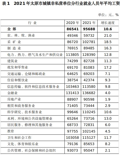 2021年太原市城鎮(zhèn)非私營(yíng)單位就業(yè)人員年平均工資95688元2021年太原市城鎮(zhèn)非私營(yíng)單位就業(yè)人員年平均工資為95688元,比上年增加9147元,名義增長(zhǎng)[1]10.6%,扣除價(jià)格因素,實(shí)際增長(zhǎng)9.5%。在崗職工(含勞務(wù)派遣人員)年平均工資為98099元。 分行業(yè)門類看,年平均工資最高的3個(gè)行業(yè)分別是金融業(yè)136682元,電力、熱力、燃?xì)饧八a(chǎn)和供應(yīng)業(yè)128390元,衛(wèi)生和社會(huì)工作115127元,分別為全市平均水平的1.4倍、1.3倍和1.2倍。年平均工資最低的三個(gè)行業(yè)分別是住宿和餐飲業(yè)42374元,農(nóng)、林、牧、漁業(yè)59732元,交通運(yùn)輸、倉(cāng)儲(chǔ)和郵政業(yè)69203元,分別為全市平均水平的44.3%、62.4%和72.3%。 工傷賠償是怎樣的???戳此:智能AI工傷計(jì)算器自助秒算賠償! 工傷賠償標(biāo)準(zhǔn)網(wǎng)(m.michaeltmooney.com)專業(yè)工傷、專注工傷 工傷就上工傷賠償標(biāo)準(zhǔn)網(wǎng)你的賠償超乎你想象! 深圳及其周邊地區(qū)免費(fèi)咨詢微信:gspc12333。 到店免費(fèi)計(jì)算工傷賠償送禮品!地址:深圳市龍崗區(qū)龍城街道龍崗大道2002號(hào)千百年商業(yè)大廈17樓(愛聯(lián)地鐵站A出口即到) 從增長(zhǎng)速度看,年平均工資增速最高的3個(gè)行業(yè)依次為農(nóng)、林、牧、漁業(yè)、采礦業(yè)、批發(fā)和零售業(yè),分別增長(zhǎng)21.0%、18.5%和17.2%。增速最低的三個(gè)行業(yè)依次為房地產(chǎn)業(yè)增長(zhǎng)1.9%,公共管理、社會(huì)保障和社會(huì)組織增長(zhǎng)2.1%,租賃和商務(wù)服務(wù)業(yè)增長(zhǎng)2.9%。