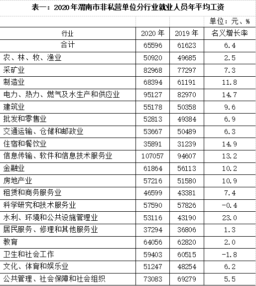 | 2020年渭南市平均工資(社平工資) 2020年渭南市非私營單位就業(yè)人員年平均工資為65596元 2020年渭南市私營單位就業(yè)人員年平均工資為43059元 工傷賠償是怎樣的???戳此:智能AI工傷計算器自助秒算賠償! 工傷賠償標準網(wǎng)(m.michaeltmooney.com)專業(yè)工傷、專注工傷 工傷就上工傷賠償標準網(wǎng)你的賠償超乎你想象! 深圳及其周邊地區(qū)免費咨詢微信:gspc12333。 到店免費計算工傷賠償送禮品!地址:深圳市龍崗區(qū)龍城街道龍崗大道2002號千百年商業(yè)大廈17樓(愛聯(lián)地鐵站A出口即到)】 2020年渭南市非私營單位就業(yè)人員年平均工資為65596元 2020年以來,國家統(tǒng)計局開始推行新的勞動工資統(tǒng)計改革,采取全面調(diào)查與抽樣調(diào)查相結合的方法,勞動工資統(tǒng)計年報實行調(diào)查數(shù)據(jù)下算一級的方法,分非私營和私營法人單位勞動工資數(shù)據(jù)。經(jīng)省統(tǒng)計局評估反饋后,現(xiàn)將2020年我市勞動工資年報數(shù)據(jù)基本情況公布如下: 一、非私營單位情況 2020年渭南市非私營單位就業(yè)人員年平均工資為65596元,與2019年的61623元相比,增加了3973元,同比名義增長6.4%。其中,在崗職工年平均工資69256元,比2019年的65814元增加了3442元,同比名義增長5.2%。 分行業(yè)門類看,年平均工資前三位的行業(yè)分別是信息傳輸、軟件和信息技術服務業(yè)107057元,是全市平均水平的1.63倍;電力、熱力、燃氣及水生產(chǎn)和供應業(yè)95127元,是全市平均水平的1.45倍;采礦業(yè)82968元,是全市平均水平的1.26倍。年平均工資后三位的行業(yè)是住宿和餐飲業(yè)35891元,為全市平均水平的54.7%;居民服務、修理和其它服務業(yè)37294元,為全市平均水平的56.9%;租賃和商務服務業(yè)46599元,為全市平均水平的71.0%。 分行業(yè)非私營單位就業(yè)人員年平均工資如下表一: