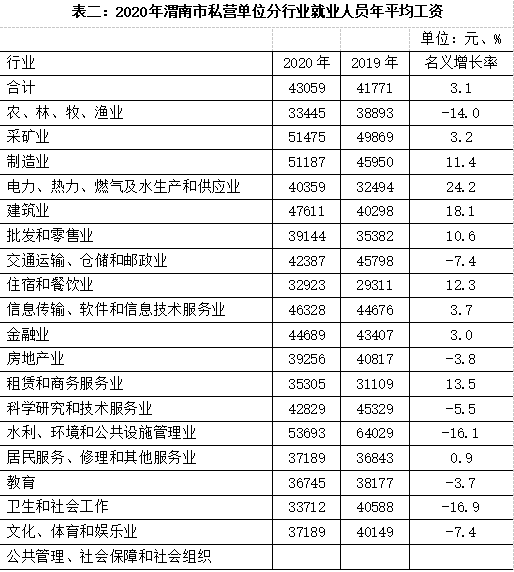 二、私營單位情況 2020年渭南市私營單位就業(yè)人員年平均工資為43059元,與2019年的41771元相比,增加了1288元,同比名義增長3.1%。 分行業(yè)門類看,年平均工資前三位的行業(yè)分別是水利、環(huán)境和公共設施管理業(yè)53693元,是全市平均水平的1.25倍;采礦業(yè)51475元,是全市平均水平的1.20倍;制造業(yè)51187元,是全市平均水平的1.19倍。年平均工資后三位的行業(yè)是住宿和餐飲業(yè)32923元,為全市平均水平的76.5%;農(nóng)、林、牧、漁業(yè)我業(yè)33445元,為全市平均水平的77.7%;衛(wèi)生和社會工作33712元,為全市平均水平的78.3%。
