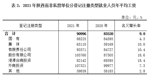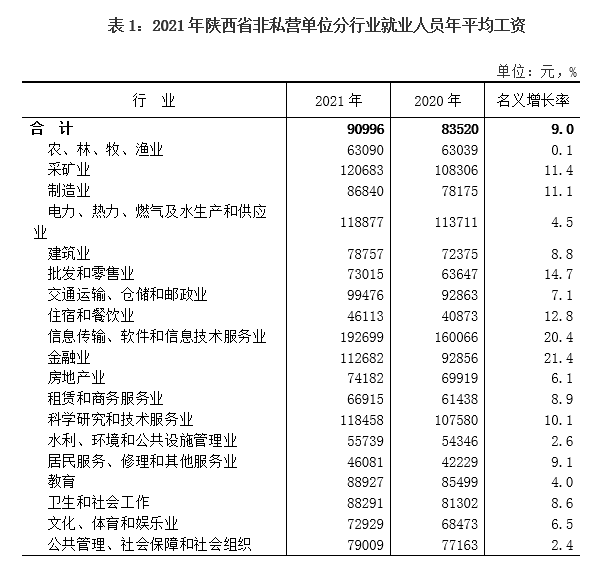 2021年陜西省平均工資(社平工資)2021年陜西省非私營單位就業(yè)人員年平均工資為90996元(折合月平均工資7583元)。 2021年陜西省私營單位就業(yè)人員年平均工資為52331元(折合月平均工資4361元,四舍五入)。 工傷賠償是怎樣的???戳此:智能AI工傷計(jì)算器自助秒算賠償! 工傷賠償標(biāo)準(zhǔn)網(wǎng)(m.michaeltmooney.com)專業(yè)工傷、專注工傷 工傷就上工傷賠償標(biāo)準(zhǔn)網(wǎng)你的賠償超乎你想象! 深圳及其周邊地區(qū)免費(fèi)咨詢微信:gspc12333。 到店免費(fèi)計(jì)算工傷賠償送禮品!地址:深圳市龍崗區(qū)龍城街道龍崗大道2002號(hào)千百年商業(yè)大廈17樓(愛聯(lián)地鐵站A出口即到) 【注:工傷賠償標(biāo)準(zhǔn)網(wǎng)(m.michaeltmooney.com)發(fā)布的平均工資數(shù)據(jù)都為官方數(shù)據(jù)(人社局、統(tǒng)計(jì)局發(fā)布的)工友可以拿此主張工傷待遇,不像網(wǎng)絡(luò)上的瞎掰的數(shù)據(jù)非官方數(shù)據(jù)(沒用)政府相關(guān)部門不認(rèn)可不能拿來主張工傷待遇。工傷賠償標(biāo)準(zhǔn)網(wǎng)(m.michaeltmooney.com)專業(yè)工傷、專注工傷。咨詢微信:gspc12333 委托代理熱線:18818685070 深圳及其周邊地區(qū)免費(fèi)咨詢微信:gspc12333。到店免費(fèi)計(jì)算工傷賠償送禮品!地址:深圳市龍崗區(qū)龍城街道龍崗大道2002號(hào)千百年商業(yè)大廈17樓(愛聯(lián)地鐵站A出口即到)】 如您想快速知道工傷怎么賠如何賠,平臺(tái)花巨資耗費(fèi)大量人力物力財(cái)力,研發(fā)了一套智能AI工傷賠償計(jì)算系統(tǒng),超級(jí)方便實(shí)用!可直接自助幫您秒算賠償,一目了然的呈現(xiàn)你的專屬賠償使其秒懂,F(xiàn)在開始立即計(jì)算賠償吧猛戳:立即計(jì)算(即可自助算)。 2021年陜西省非私營單位就業(yè)人員年平均工資為90996元2021年陜西省非私營單位就業(yè)人員年平均工資為90996元,與2020年的83520元相比,增加了7476元,同比名義增長9.0%,增速較上年提高2.4個(gè)百分點(diǎn)?鄢飪r(jià)因素,2021年全省非私營單位就業(yè)人員年平均工資實(shí)際增長7.4%。 分行業(yè)門類看,年平均工資最高的三個(gè)行業(yè)分別是信息傳輸、軟件和信息技術(shù)服務(wù)業(yè)192699元,采礦業(yè)120683元,電力、熱力、燃?xì)饧八a(chǎn)和供應(yīng)業(yè)118877元,分別為全省平均水平的2.12倍、1.33倍和1.31倍。年平均工資最低的三個(gè)行業(yè)分別是居民服務(wù)、修理和其他服務(wù)業(yè)46081元,住宿和餐飲業(yè)46113元,水利、環(huán)境和公共設(shè)施管理業(yè)55739元,分別為全省平均水平的50.6%、50.7%和61.3%。 從增長速度看,年平均工資增速最高的三個(gè)行業(yè)依次為金融業(yè),信息傳輸、軟件和信息技術(shù)服務(wù)業(yè),批發(fā)和零售業(yè),分別增長21.4%、20.4%和14.7%。增速最低的三個(gè)行業(yè)依次為農(nóng)、林、牧、漁業(yè),公共管理、社會(huì)保障和社會(huì)組織,水利、環(huán)境和公共設(shè)施管理業(yè),分別增長0.1%、2.4%和2.6%。