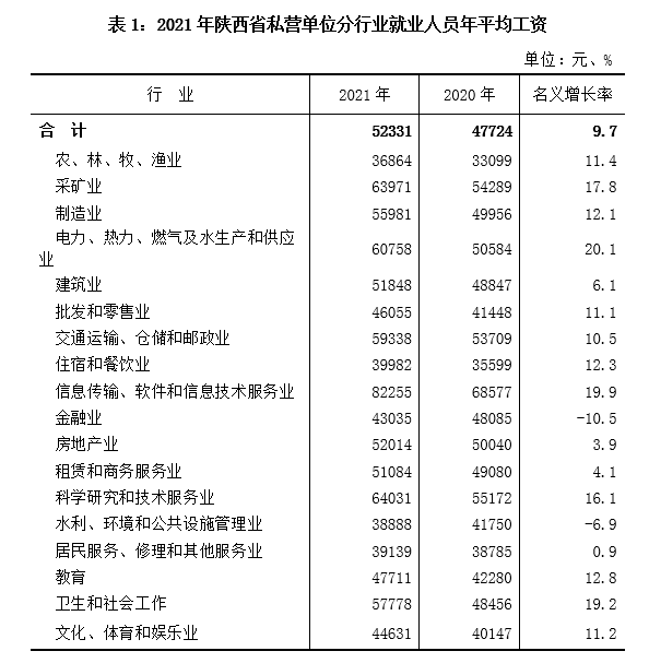 2021年陜西省私營單位就業(yè)人員年平均工資為52331元2021年陜西省私營單位就業(yè)人員年平均工資為52331元,與2020年的47724元相比,增加了4607元,同比名義增長9.7%,增速較上年回落0.1個(gè)百分點(diǎn)。扣除物價(jià)因素,2021年全省私營單位就業(yè)人員年平均工資實(shí)際增長8.1%。 分行業(yè)門類看,年平均工資最高的三個(gè)行業(yè)分別是信息傳輸、軟件和信息技術(shù)服務(wù)業(yè)82255元,科學(xué)研究和技術(shù)服務(wù)業(yè)64031元,采礦業(yè)63971元,分別為全省平均水平的1.57倍、1.22倍和1.22倍。年平均工資最低的三個(gè)行業(yè)分別是農(nóng)、林、牧、漁業(yè)36864元,水利、環(huán)境和公共設(shè)施管理業(yè)38888元,居民服務(wù)、修理和其他服務(wù)業(yè)39139元,分別為全省平均水平的70.4%、74.3%和74.8%。 從增長速度看,年平均工資增速居前的三個(gè)行業(yè)依次為電力、熱力、燃?xì)饧八a(chǎn)和供應(yīng)業(yè),信息傳輸、軟件和信息技術(shù)服務(wù)業(yè),衛(wèi)生和社會(huì)工作,分別增長20.1%、19.9%和19.2%。增速居后的三個(gè)行業(yè)為金融業(yè),水利、環(huán)境和公共設(shè)施管理業(yè),居民服務(wù)、修理和其他服務(wù)業(yè)。